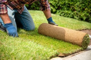 Man laying grass turf rolls for new garden lawn
